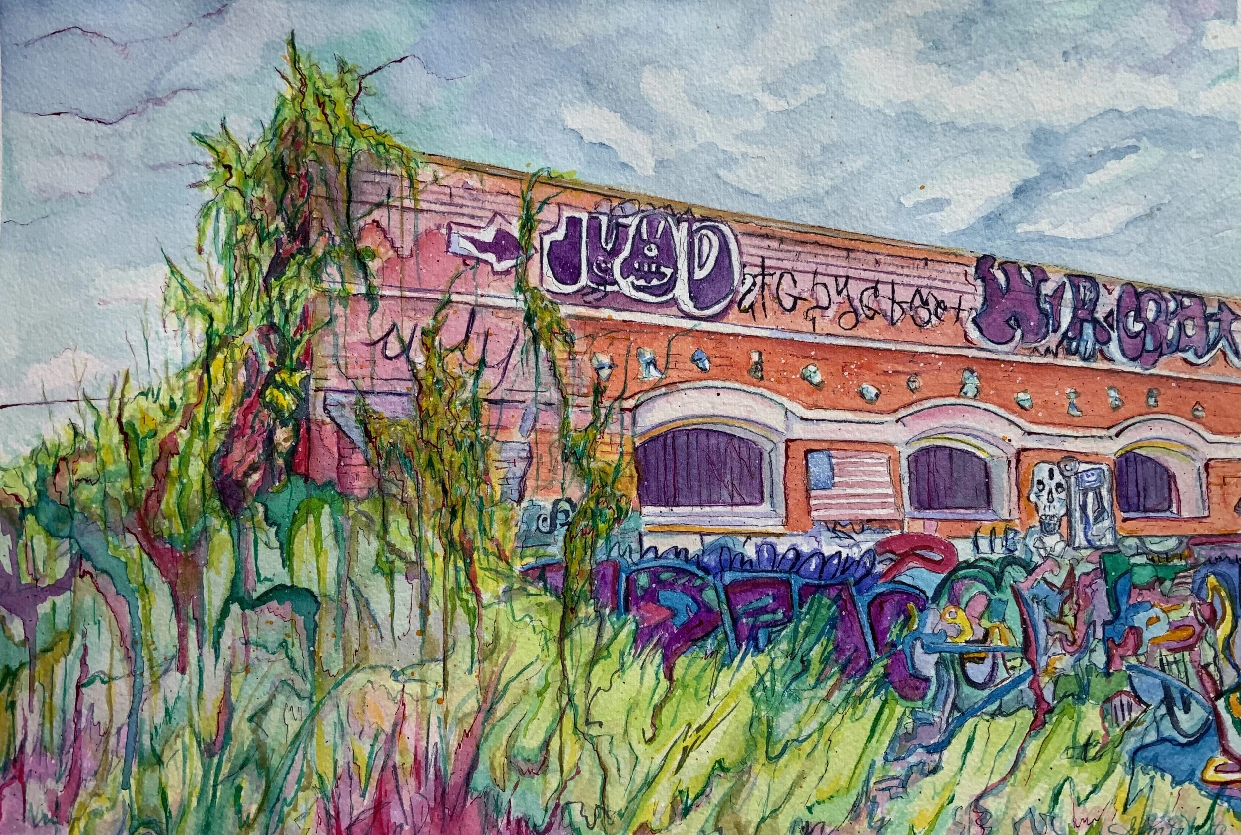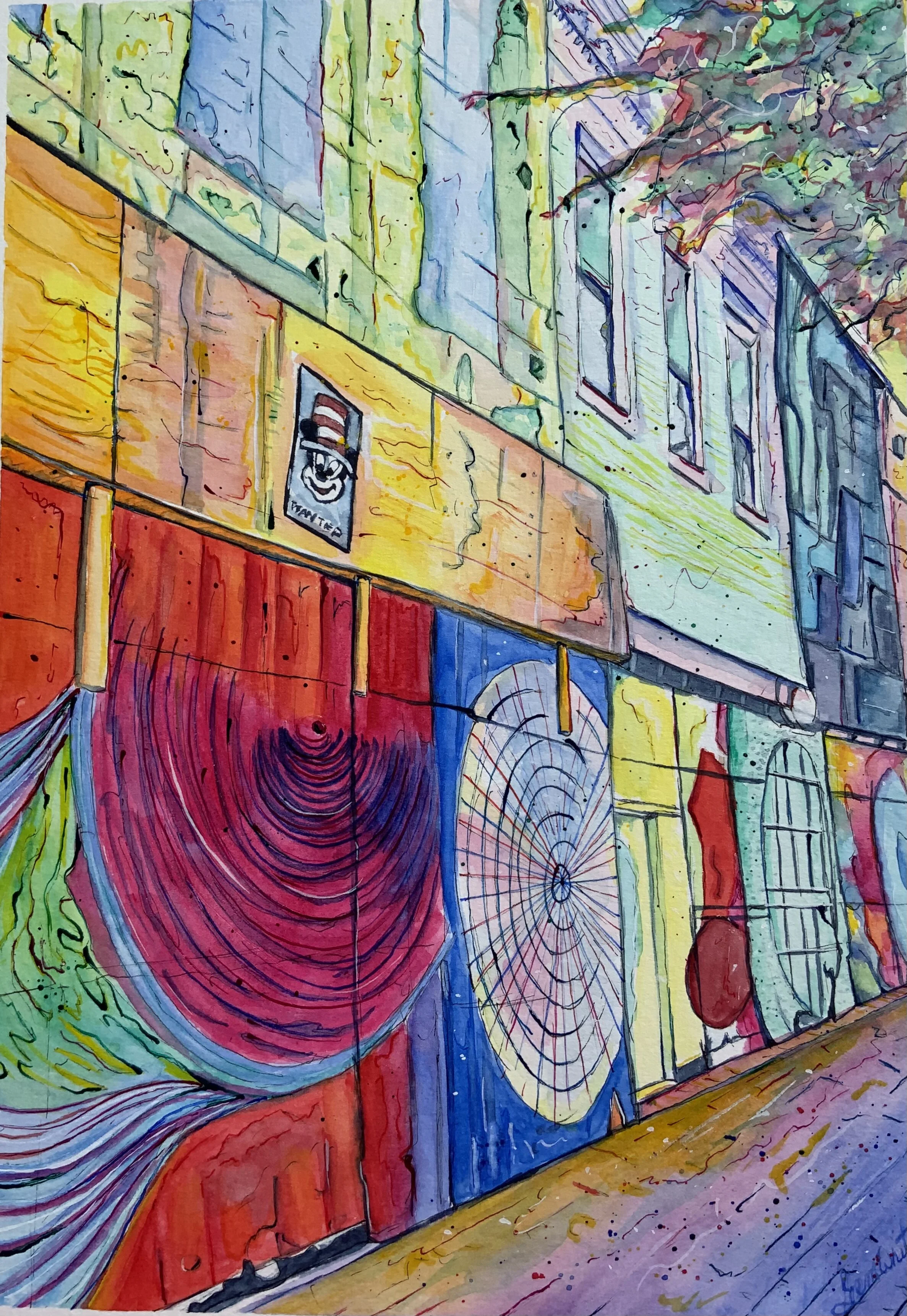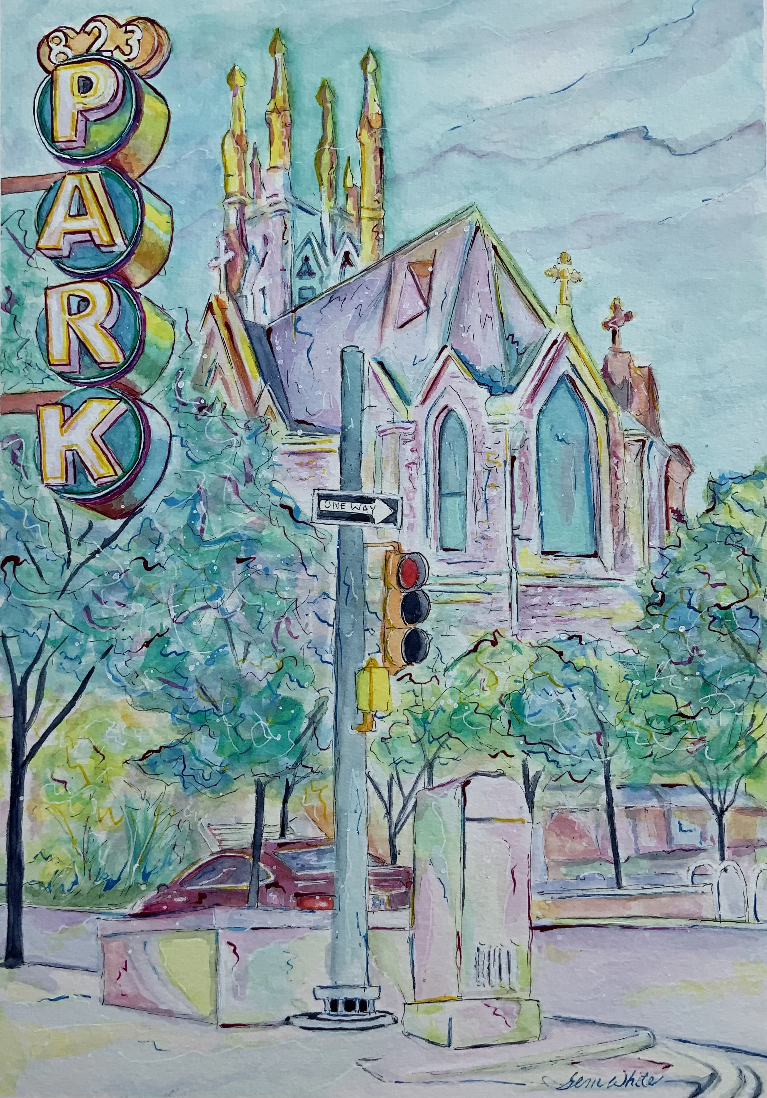 When we first arrived in Downtown Austin many of the buildings were boarded up. It was a little scary to see a normally bustling city at a standstill due to the pandemic. Slowly the boards starting coming off and life gradually started creeping back in. What concerns me are the ones that are still boarded up. Will they renovate these old buildings or tear them down and replace them with something new. Here’s hoping the charm of the old that is so much a part of Austin will remain intact. Since I painted this picture the old colorful boards have been removed and replaced. Looks like something is about to happen…